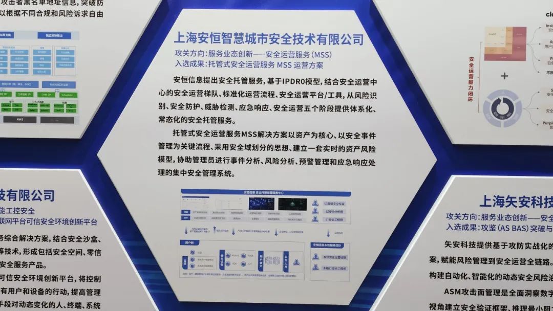 活動現(xiàn)場,還發(fā)布了2023年度上海市網(wǎng)絡(luò)安全產(chǎn)業(yè)創(chuàng)新攻關(guān)成果目錄,在“服務(wù)業(yè)態(tài)創(chuàng)新——安全運(yùn)營服務(wù)(MSS)”方向上,上海安恒智慧攜“托管式安全運(yùn)營服務(wù)MSS運(yùn)營方案”成功入選。