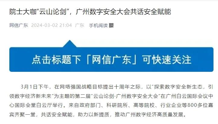 本屆大會(huì)云集中國(guó)工程院、政府、高校、企業(yè)等多方數(shù)字安全領(lǐng)域?qū)<?,共話安全賦能,助力以新提質(zhì),推動(dòng)廣州數(shù)字經(jīng)濟(jì)高質(zhì)量發(fā)展。會(huì)后,各方媒體深度挖掘與會(huì)嘉賓主題演講內(nèi)容,提煉觀點(diǎn)、總結(jié)金句、賦能未來。