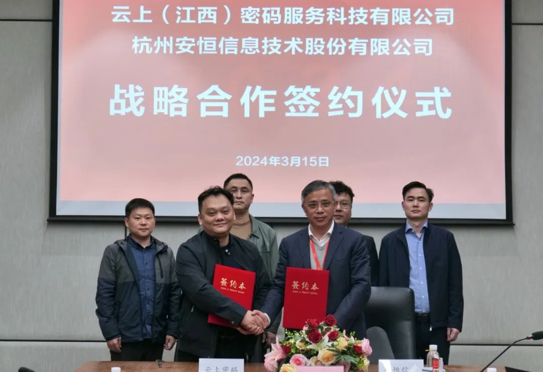 3月15日,安恒信息與云上(江西)密碼服務(wù)科技有限公司(以下簡(jiǎn)稱“云上密碼”)正式簽訂戰(zhàn)略合作協(xié)議,雙方將聚焦密碼與信創(chuàng)領(lǐng)域展開(kāi)全面合作。