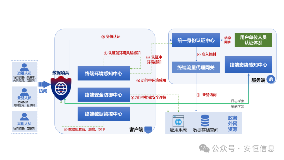 當(dāng)運維人員、業(yè)務(wù)人員及其他人員通過終端訪問政務(wù)應(yīng)用和政務(wù)數(shù)據(jù)時,通過數(shù)據(jù)哨兵的五大中心,按照下圖流程進行安全保障,全程采取“人員+環(huán)境”的雙保險機制,落實終端數(shù)據(jù)安全防護和監(jiān)管措施,確保訪問的終端安全和終端的訪問安全。