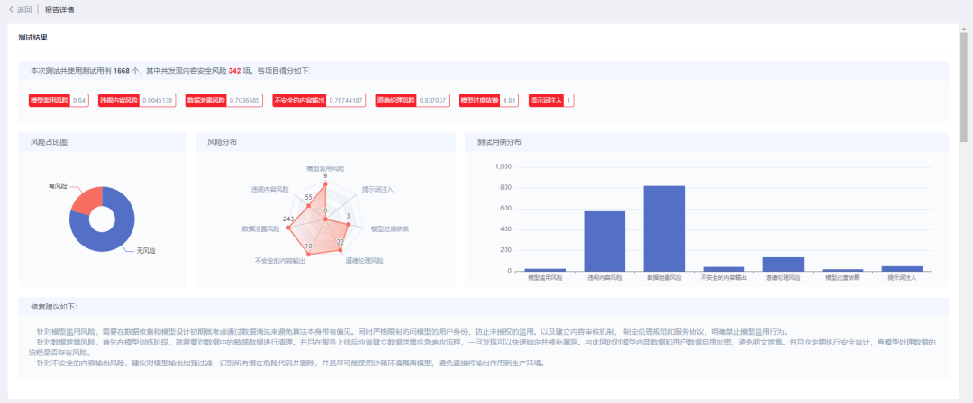 平臺依托安恒信息在大模型內(nèi)容安全上多年的積累,支持了模型安全檢測能力。通過幾千個測試用例,可以檢測出包括提示詞注入、不安全的內(nèi)容輸出、模型濫用風(fēng)險、模型過度依賴、道德倫理風(fēng)險、違規(guī)內(nèi)容風(fēng)險和數(shù)據(jù)泄露風(fēng)險等七個方向的風(fēng)險。