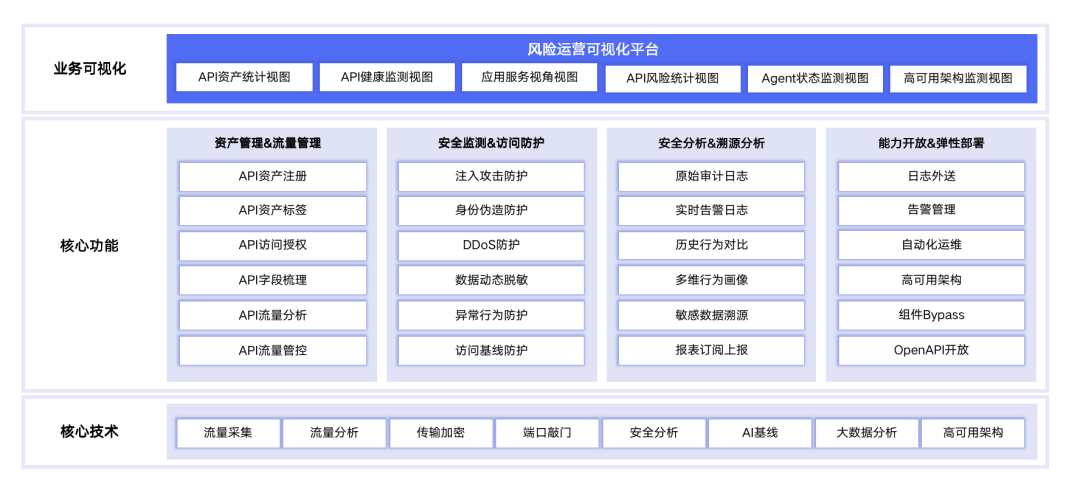 某運(yùn)營商大數(shù)據(jù)中心,負(fù)責(zé)為集團(tuán)各部門業(yè)務(wù)單元提供集團(tuán)級的業(yè)務(wù)API數(shù)據(jù)服務(wù)。急需構(gòu)建一套行之有效的API調(diào)用運(yùn)營體系,確保其在傳輸鏈路、身份控制、調(diào)用鑒權(quán)、行為監(jiān)測、數(shù)據(jù)保護(hù)、風(fēng)險回溯和預(yù)警處置等各環(huán)節(jié)具備安全防護(hù)能力,防范“未授權(quán)調(diào)用”、“授權(quán)違規(guī)調(diào)用”、“敏感數(shù)據(jù)泄露”等核心安全場景的隱患,并實(shí)現(xiàn)可視化風(fēng)險管理。