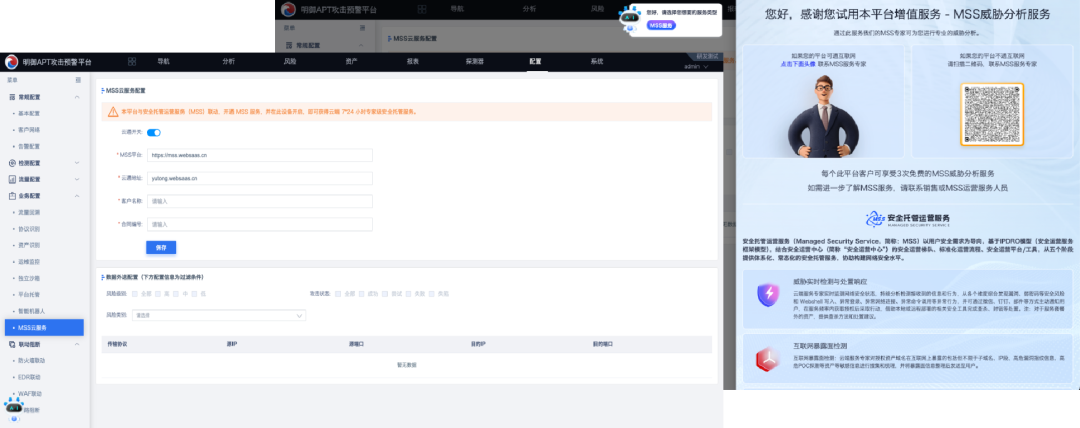每一個參與攻防演練的人,在面對海量告警數(shù)據(jù),都會感覺到崩潰和無奈。但是這個噩夢今年就能得到解脫,明御APT攻擊預警平臺內置的云通組件,可將威脅告警外送到MSS運營中心,并由云端AI恒腦結合MSS專家服務協(xié)助告警分析研判及事件處置。