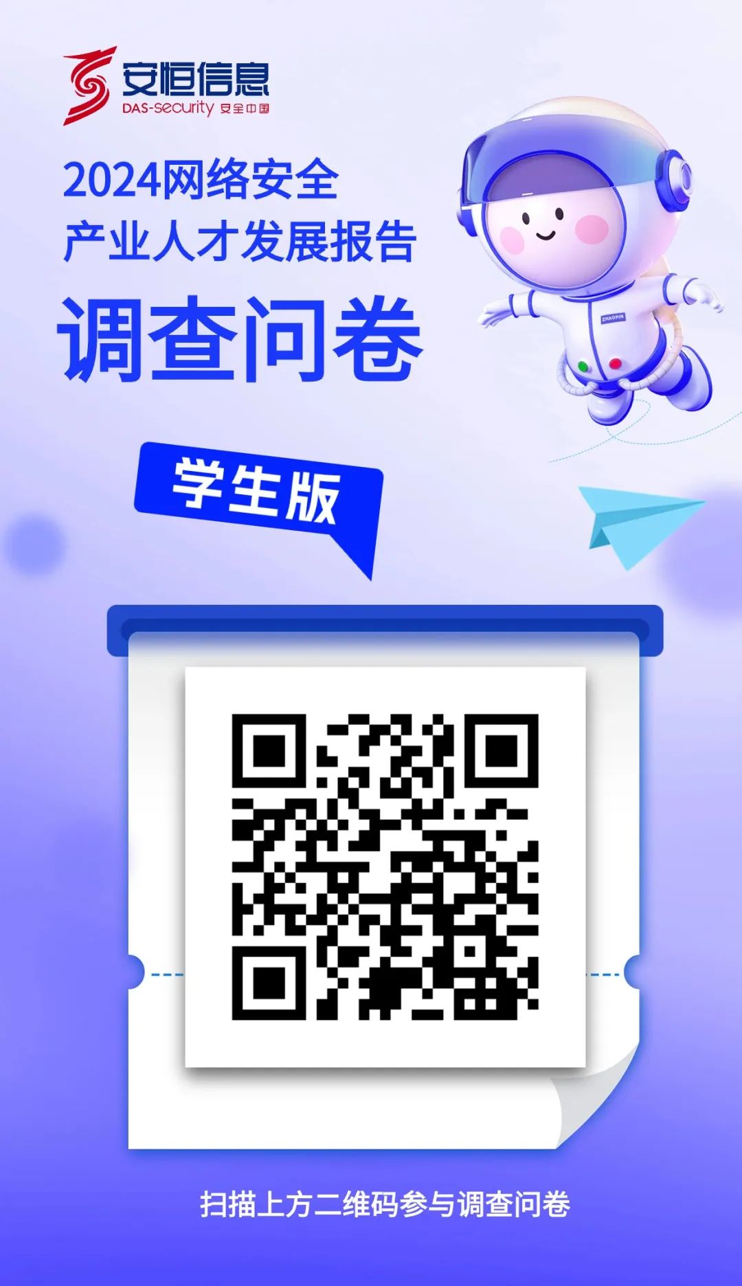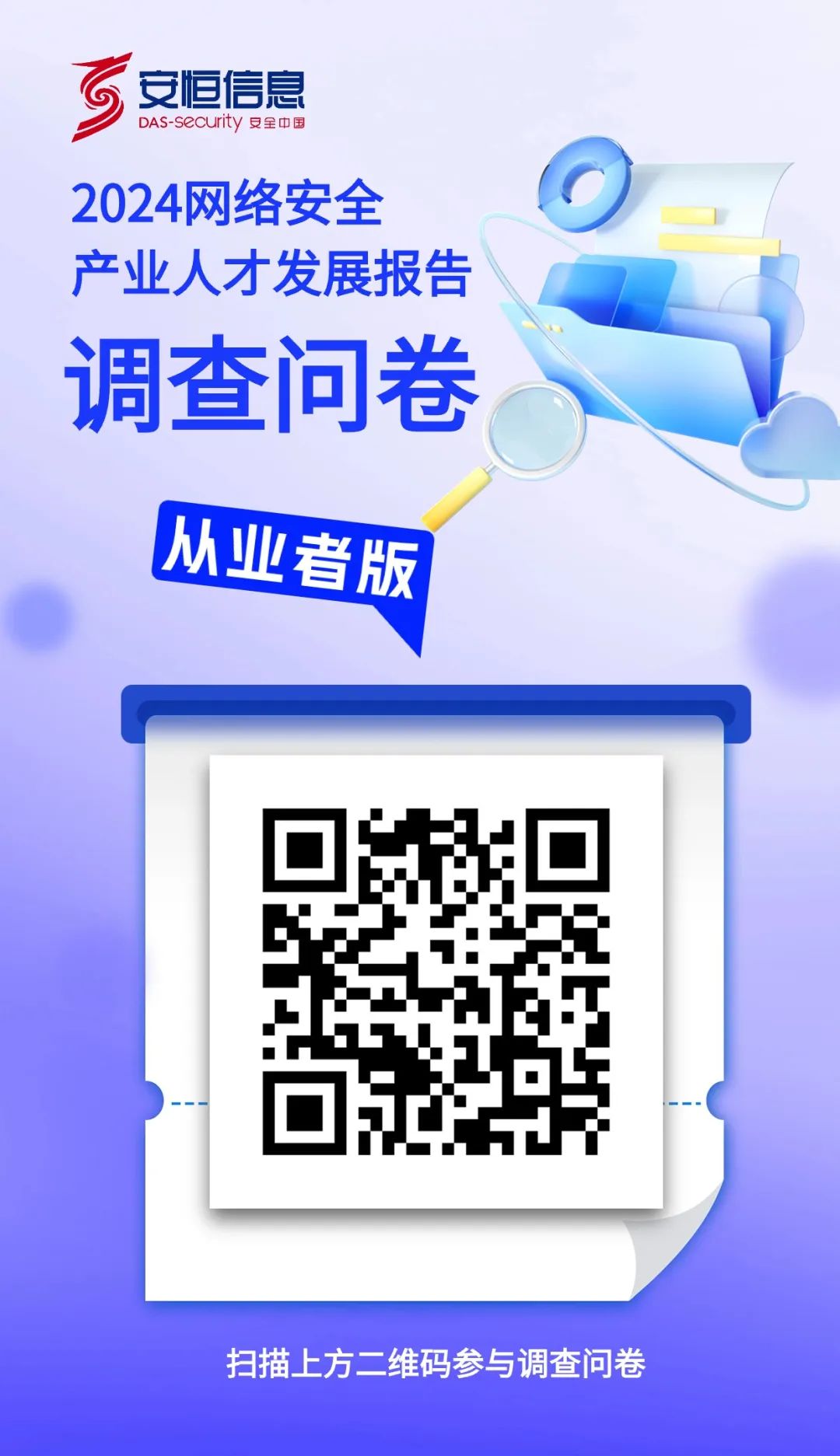 為助力我國網絡安全人才培養(yǎng)建設,增加高技能人才培養(yǎng)創(chuàng)新性意見,安恒信息發(fā)起《2024網絡安全人才發(fā)展報告調查問卷-學生版》《2024網絡安全人才發(fā)展報告調查問卷-從業(yè)人員版》,為后續(xù)發(fā)布《2024網絡安全產業(yè)人才發(fā)展報告》奠定基礎。