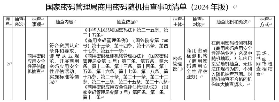 近日,國家密碼管理局發(fā)布《國家密碼局商用密碼隨機(jī)抽查事項(xiàng)清單(2024版)》的公告。自發(fā)布之日(2024年7月19日)起施行,2018年7月7日發(fā)布的《國家密碼管理局關(guān)于印發(fā)商用密碼隨機(jī)抽查事項(xiàng)清單的通知》(國密局字〔2018〕268號)同時廢止。