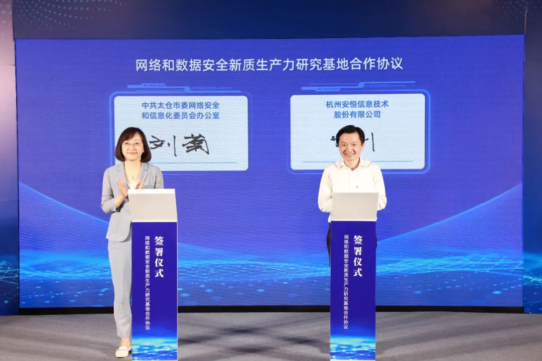 現(xiàn)場,太倉市委宣傳部常務副部長、市委網(wǎng)信辦主任劉菊、安恒信息董事長范淵共同簽署了太倉市網(wǎng)絡和數(shù)據(jù)安全新質(zhì)生產(chǎn)力研究基地合作協(xié)議。安恒信息將助力太倉創(chuàng)新建設網(wǎng)絡和數(shù)據(jù)安全新質(zhì)生產(chǎn)力研究基地,助推太倉相關產(chǎn)業(yè)網(wǎng)絡化、數(shù)字化、智能化加速轉(zhuǎn)型,大力發(fā)展以數(shù)據(jù)為關鍵要素的新質(zhì)生產(chǎn)力。