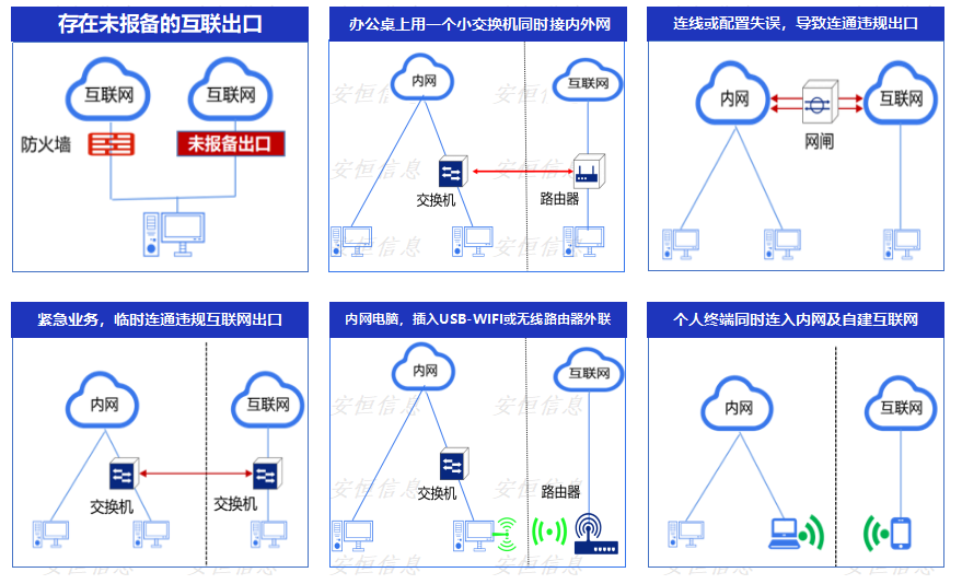 當(dāng)前,大數(shù)據(jù)管理局作為推動(dòng)智慧城市建設(shè)和政府?dāng)?shù)字化轉(zhuǎn)型的核心力量,肩負(fù)著統(tǒng)籌推進(jìn)電子政務(wù)基礎(chǔ)設(shè)施建設(shè)和安全管理的重任。然而,在電子政務(wù)外網(wǎng)的實(shí)際運(yùn)營(yíng)中,仍存在嚴(yán)重的違規(guī)外聯(lián)安全挑戰(zhàn)。違規(guī)外聯(lián)的典型方式如下: