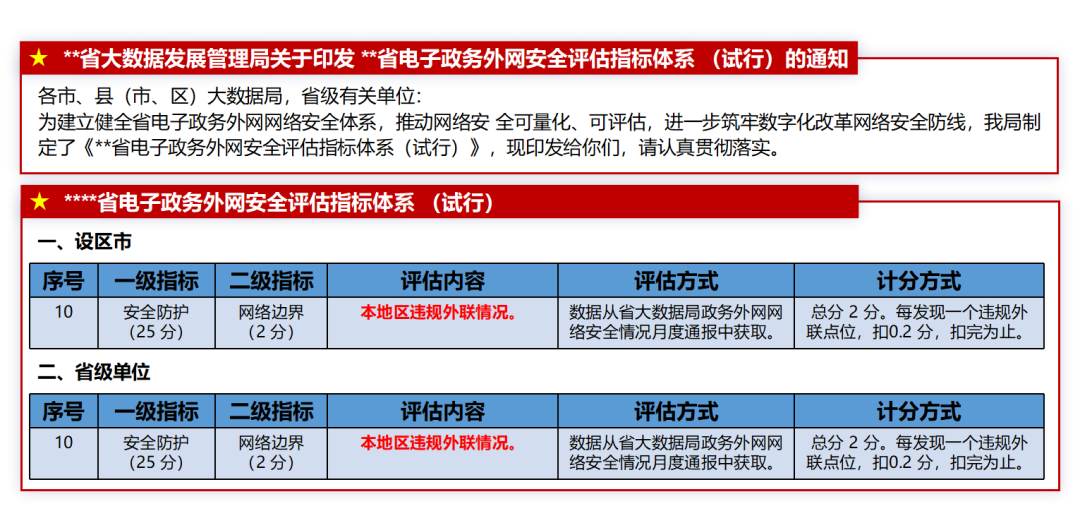 某省大數(shù)據(jù)發(fā)展管理局《浙江省電子政務(wù)外網(wǎng)安全評(píng)估指標(biāo)體系(試行)的通知》