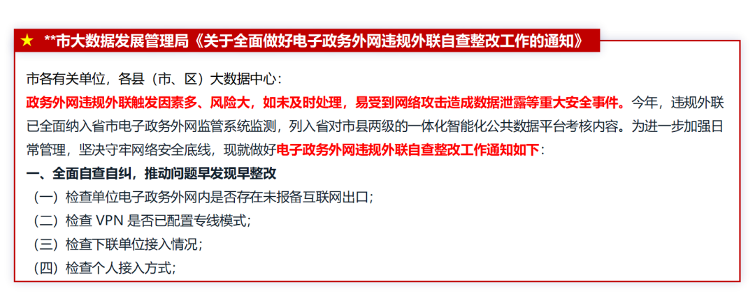 某市大數(shù)據(jù)發(fā)展管理局《關(guān)于全面做好電子政務(wù)外網(wǎng)違規(guī)外聯(lián)自查整改工作的通知》