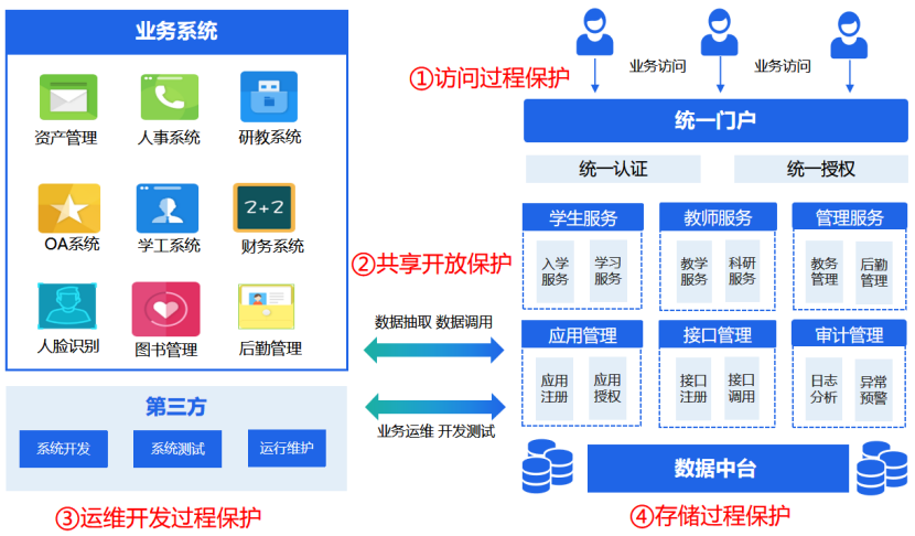 某大學(xué)不斷加大智慧校園建設(shè)方面的投入,通過(guò)數(shù)據(jù)中心建設(shè),實(shí)現(xiàn)了校內(nèi)數(shù)據(jù)匯集、融合與開(kāi)放,較好地解決了以往業(yè)務(wù)發(fā)展的“信息孤島”和“數(shù)據(jù)孤島”問(wèn)題。但是隨著數(shù)據(jù)不斷積累,數(shù)據(jù)處理的角色更多元,系統(tǒng)、業(yè)務(wù)邊界更模糊,業(yè)務(wù)趨于協(xié)同,數(shù)據(jù)的處理活動(dòng)難以追溯和控制,傳統(tǒng)的網(wǎng)絡(luò)安全防護(hù)手段很難專門應(yīng)對(duì)數(shù)據(jù)安全風(fēng)險(xiǎn),圍繞數(shù)據(jù)的處理活動(dòng)中所面臨的敏感信息泄露風(fēng)險(xiǎn),需要構(gòu)建一套有效的數(shù)據(jù)安全防護(hù)體系,確保數(shù)據(jù)安全可控。