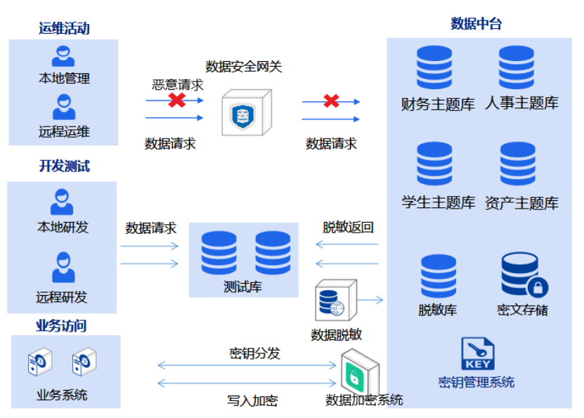 安恒信息敏感數(shù)據(jù)保護(hù)解決方案由數(shù)據(jù)庫(kù)防火墻、數(shù)據(jù)庫(kù)運(yùn)維系統(tǒng)、數(shù)據(jù)脫敏系統(tǒng)、數(shù)據(jù)加密系統(tǒng)、數(shù)據(jù)安全管理平臺(tái)五部分組成,彌補(bǔ)高校敏感數(shù)據(jù)在訪問(wèn)過(guò)程、運(yùn)維過(guò)程、共享開(kāi)放過(guò)程與存儲(chǔ)過(guò)程存在的安全短板,降低數(shù)據(jù)安全風(fēng)險(xiǎn),構(gòu)建高質(zhì)量的數(shù)據(jù)安全防護(hù)能力,以確保敏感數(shù)據(jù)安全。