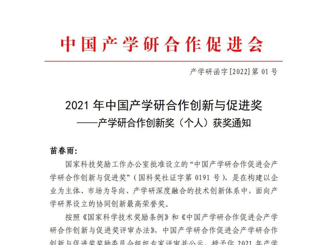 苗春雨榮獲產(chǎn)學(xué)研合作創(chuàng)新獎(jiǎng)