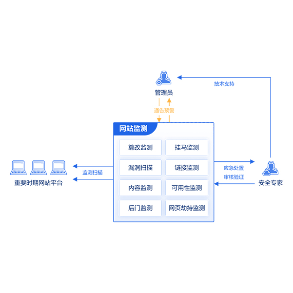 對網(wǎng)站進行頁面資源與指紋信息的分析,通過監(jiān)測技術(shù)對各類安全事件進行全面分析感知,包括篡改、黑頁、掛馬、后門等,并向相關(guān)部門和人員進行定向安全通報。