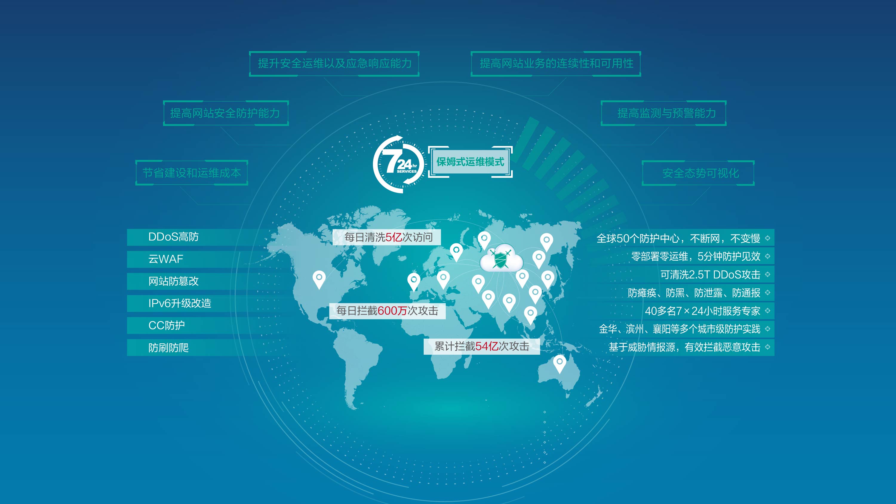 云防護(hù):聯(lián)動2.5T云端抗D、IPv6升級改造及防護(hù)、Web攻擊防護(hù)、聯(lián)動威脅情報(bào)防護(hù)、CC/爬蟲防護(hù)、網(wǎng)站防篡改、一箭關(guān)停