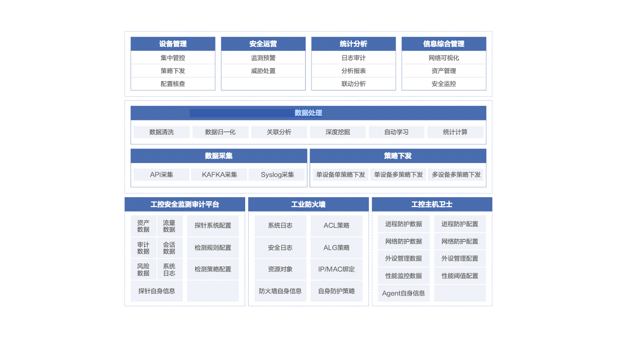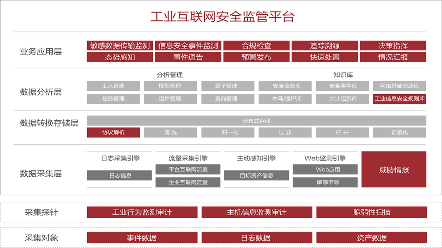 平臺通過數(shù)據(jù)采集的方式,從安全分析、環(huán)境管理和安全審計三個維度出發(fā),達到對工業(yè)控制系統(tǒng)網(wǎng)絡安全狀態(tài)的全方面監(jiān)控,幫助工業(yè)企業(yè)及時了解并處理安全問題。 -