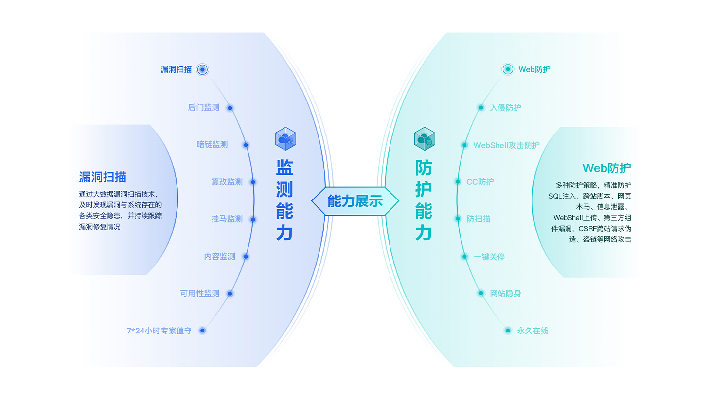 對(duì)網(wǎng)站web漏洞、暗鏈、黑頁(yè)、掛馬、挖礦、webshell、網(wǎng)站可用性、敏感詞匯等進(jìn)行實(shí)時(shí)監(jiān)測(cè)并預(yù)警。