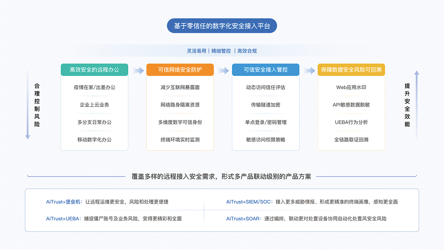 · 疫情嚴(yán)峻,安恒信息作為一家有社會(huì)責(zé)任感的網(wǎng)絡(luò)安全企業(yè),以零信任理念為底座,打造輕量化、體驗(yàn)佳、安全可靠的數(shù)字化安全接入平臺(tái)Aitrust,可覆蓋多種場(chǎng)景下遠(yuǎn)程接入需求,為企業(yè)提供堅(jiān)強(qiáng)安全后盾保障業(yè)務(wù)延續(xù),傾力向各界提供免費(fèi)180天服務(wù),助力共克疫情時(shí)艱。