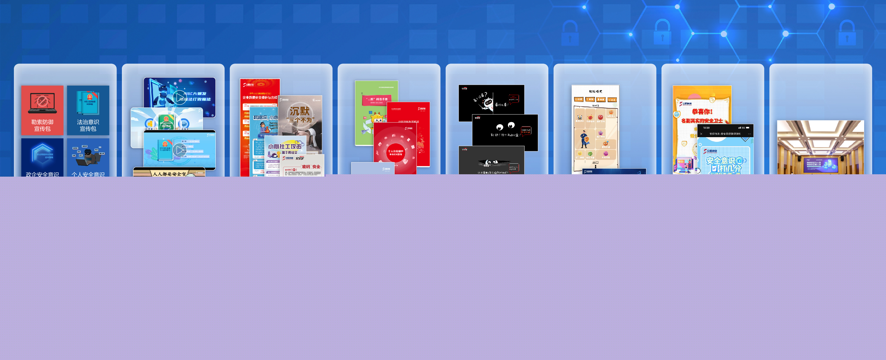 ? ? ·月度安全主題海報(bào)定制:每月根據(jù)特定主題設(shè)計(jì)海報(bào),用于線(xiàn)上線(xiàn)下宣傳。? ? ·網(wǎng)絡(luò)安全周(網(wǎng)安周)支持:提供活動(dòng)策劃、宣傳材料設(shè)計(jì)、現(xiàn)場(chǎng)布置等服務(wù)。