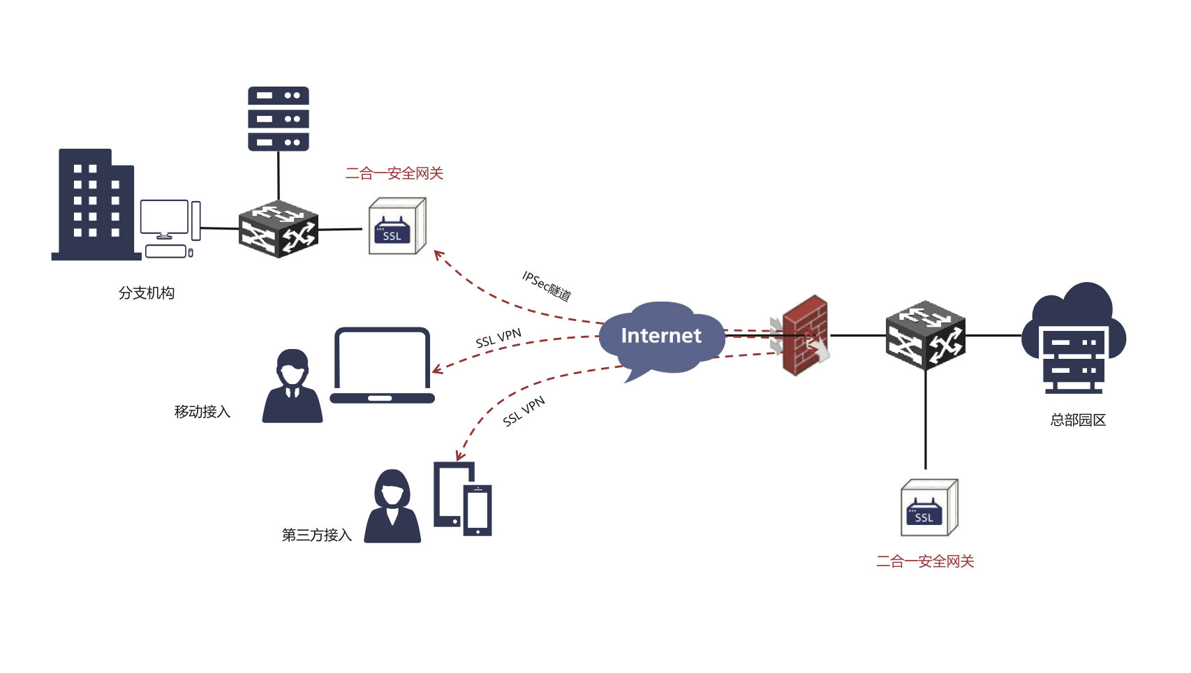 IPSec/SSL VPN綜合安全網(wǎng)關(guān)是一款能夠有效防止業(yè)務(wù)數(shù)據(jù)在網(wǎng)絡(luò)傳輸中被竊取、篡改的網(wǎng)絡(luò)安全產(chǎn)品,為用戶提供了完善的內(nèi)部網(wǎng)絡(luò)或應(yīng)用程序的安全遠(yuǎn)程接入服務(wù)以及各分支機(jī)構(gòu)局域網(wǎng)之間的數(shù)據(jù)安全傳輸和安全訪問服務(wù)。