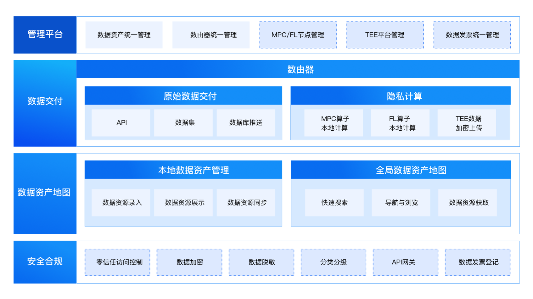 可用不可見(jiàn)交付:通過(guò)TEE、MPC、FL等方式實(shí)現(xiàn)數(shù)據(jù)的可用不可見(jiàn)交付。