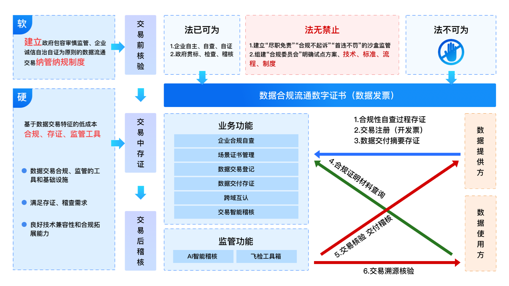 數(shù)據(jù)合規(guī)流通數(shù)字證書(數(shù)據(jù)發(fā)票)是“政府包容、審慎監(jiān)管、和企業(yè)誠信自主自證的數(shù)據(jù)流通和交易制度”的新型監(jiān)管工具。設(shè)計遵循“三不兩實現(xiàn)”原則:“三不”不參與交易過程、不接觸交易數(shù)據(jù)、不成為交易第三方;“兩實現(xiàn)”低成本實現(xiàn)合規(guī)交易存證、無代碼實現(xiàn)安全高效抽檢。