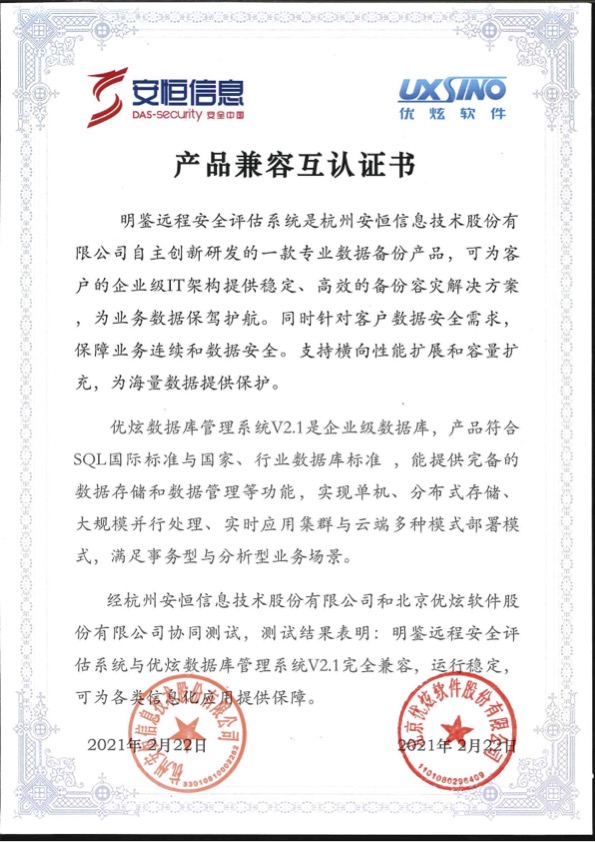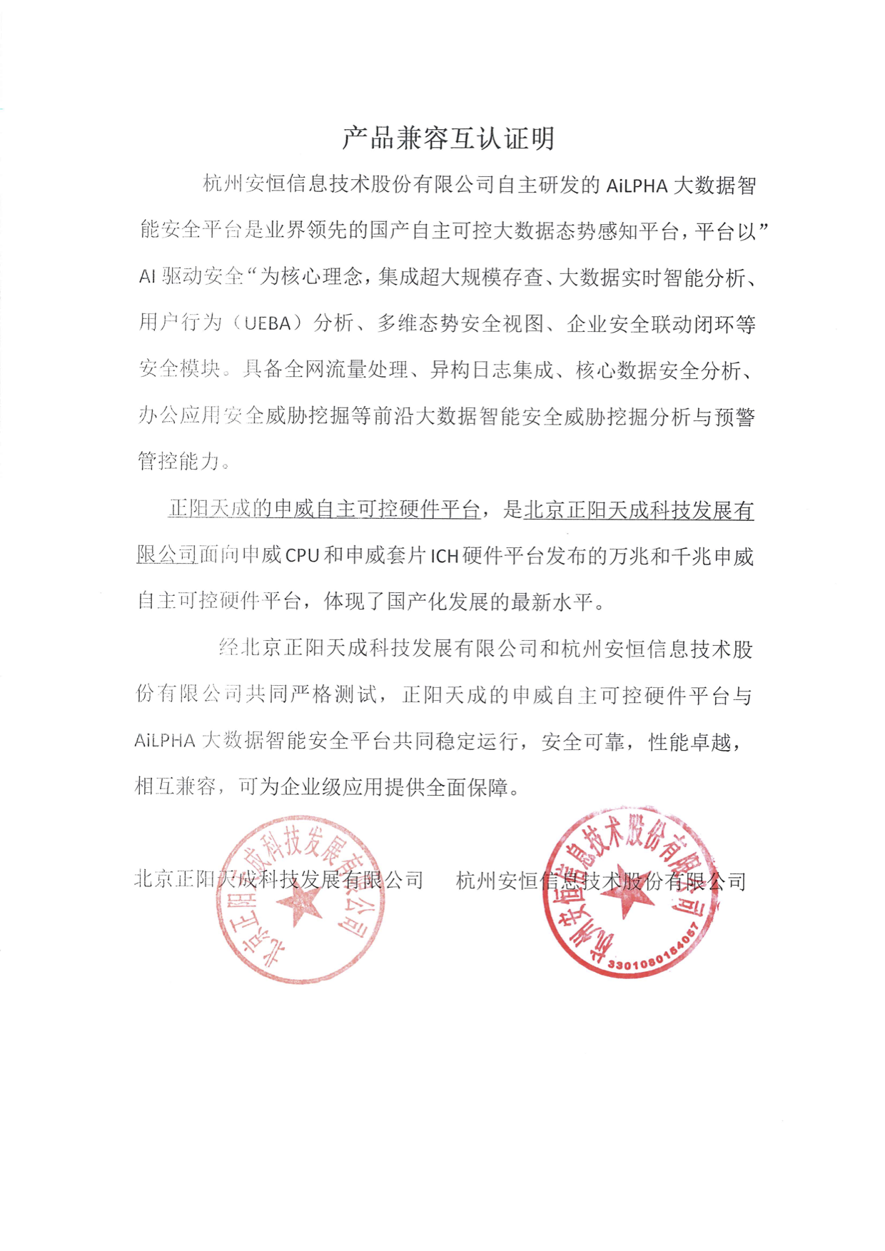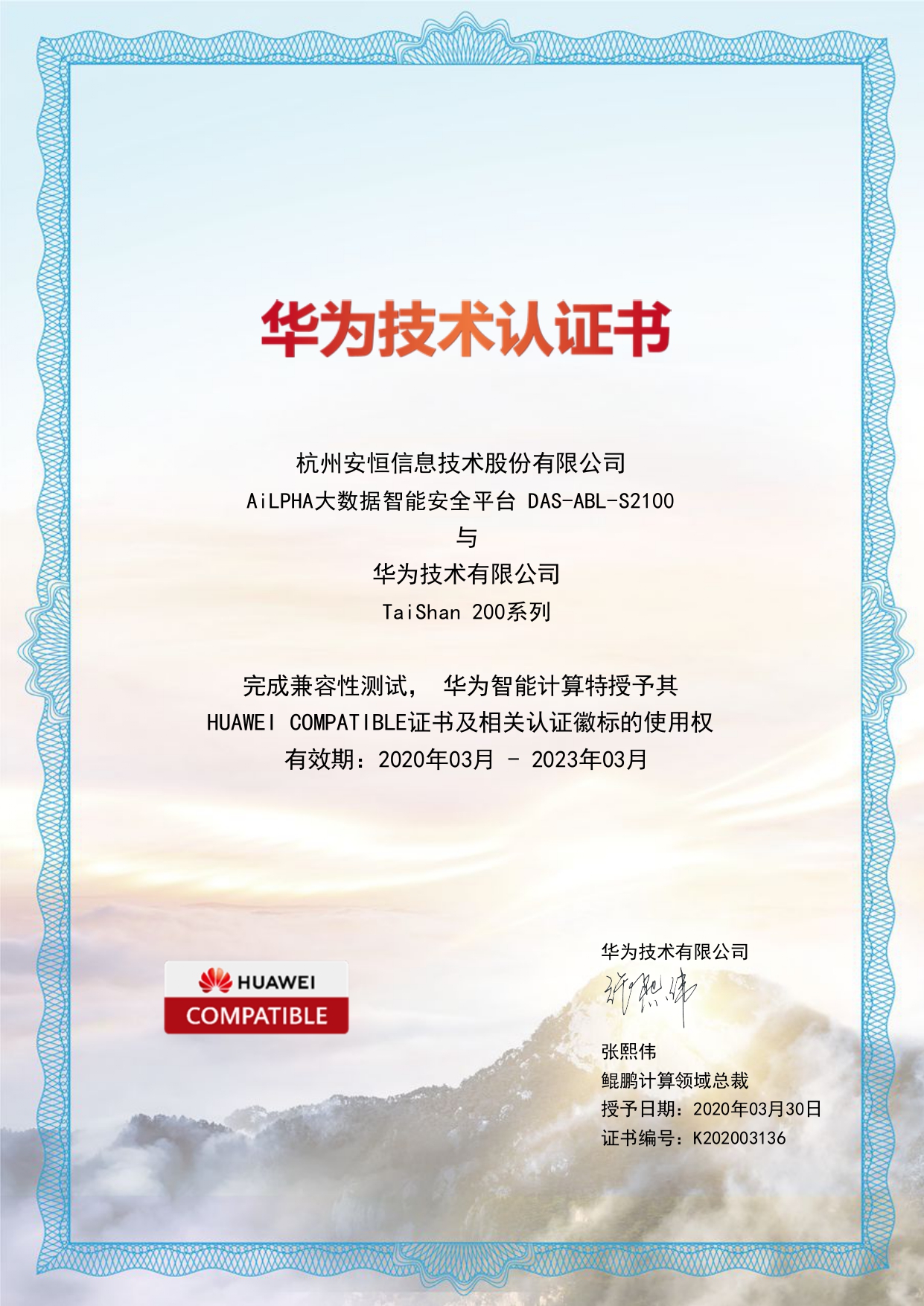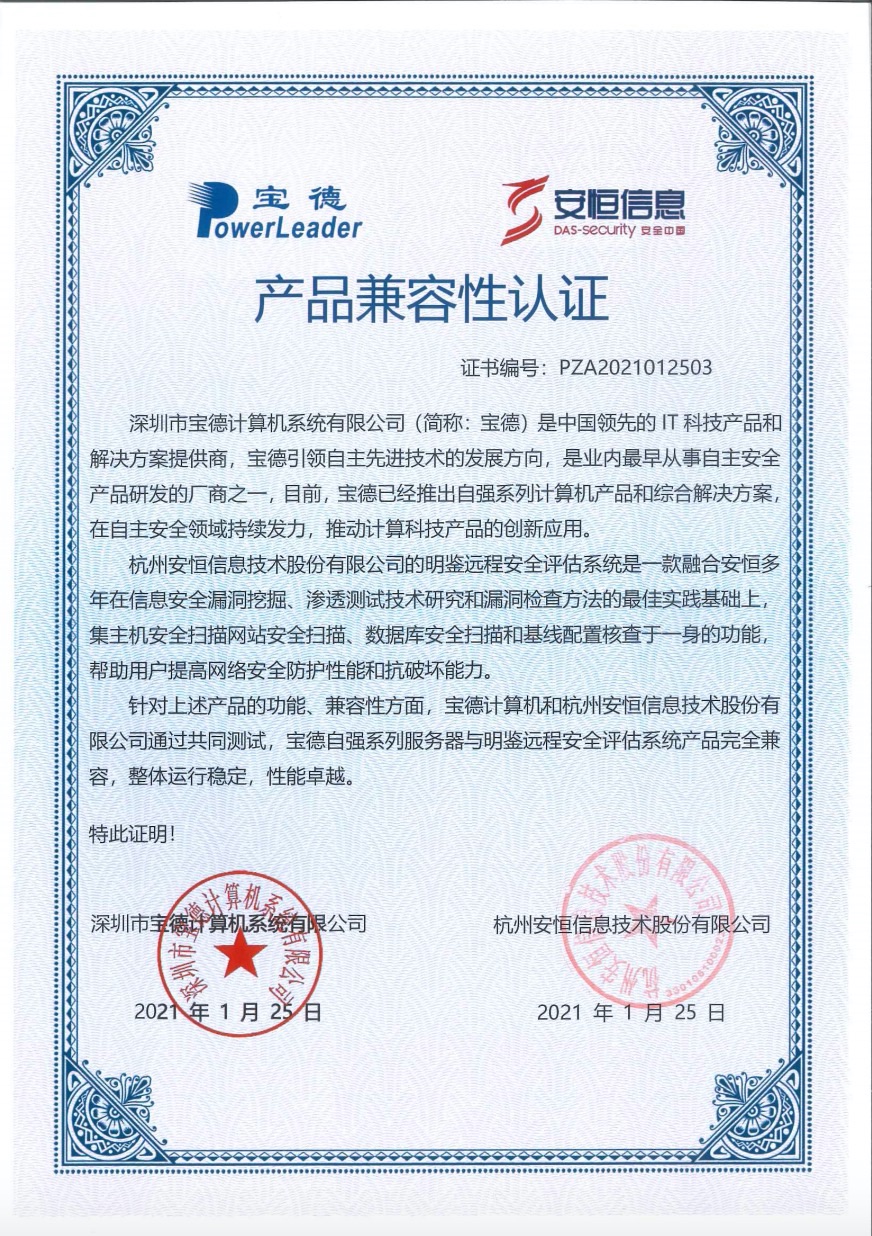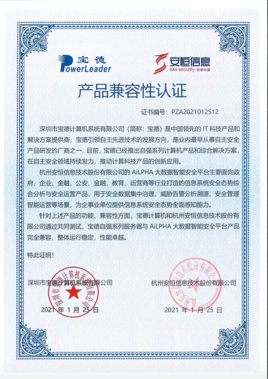 - 安恒信息AiLPHA大數(shù)據(jù)智能安全平臺(tái)、APT攻擊預(yù)警平臺(tái)分別與華為TaiShan 200系列完成兼容性測(cè)試。華為智能計(jì)算授予安恒信息HUAWEI COMPATIBLE證書(shū)及相關(guān)認(rèn)證徽標(biāo)使用權(quán)。