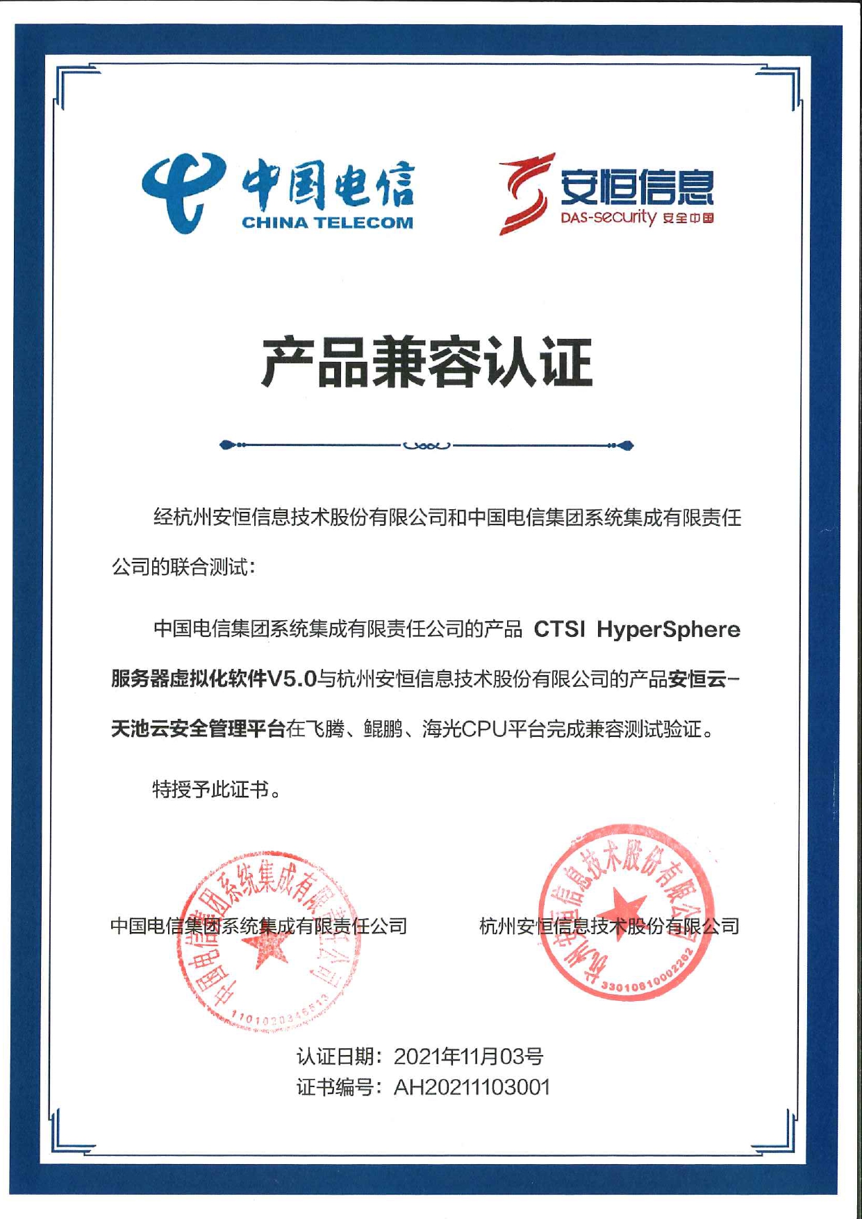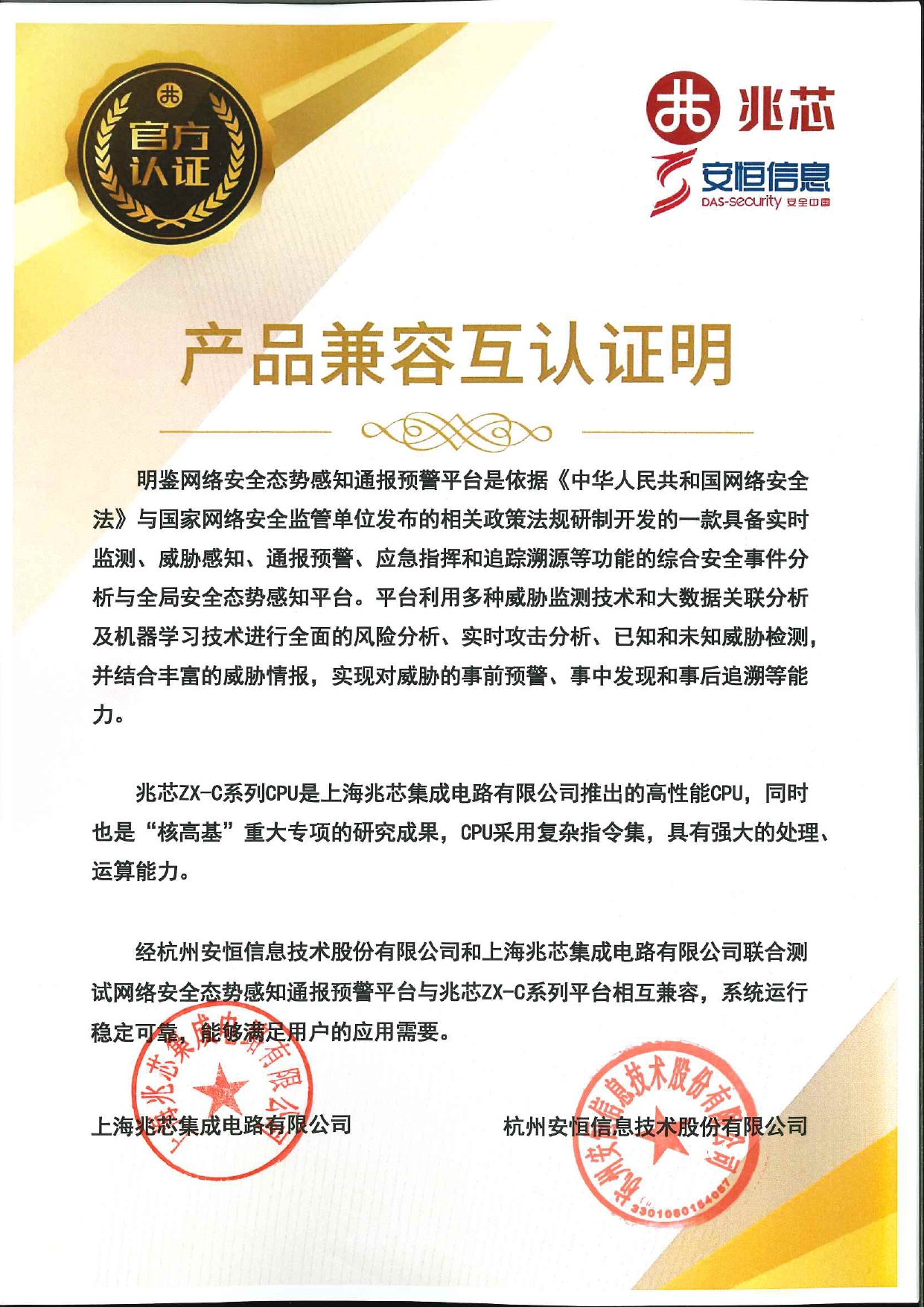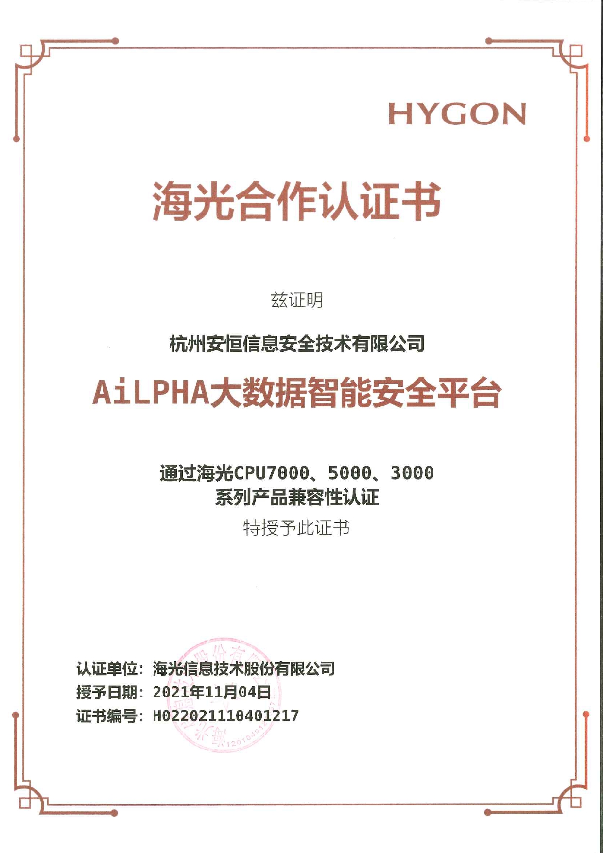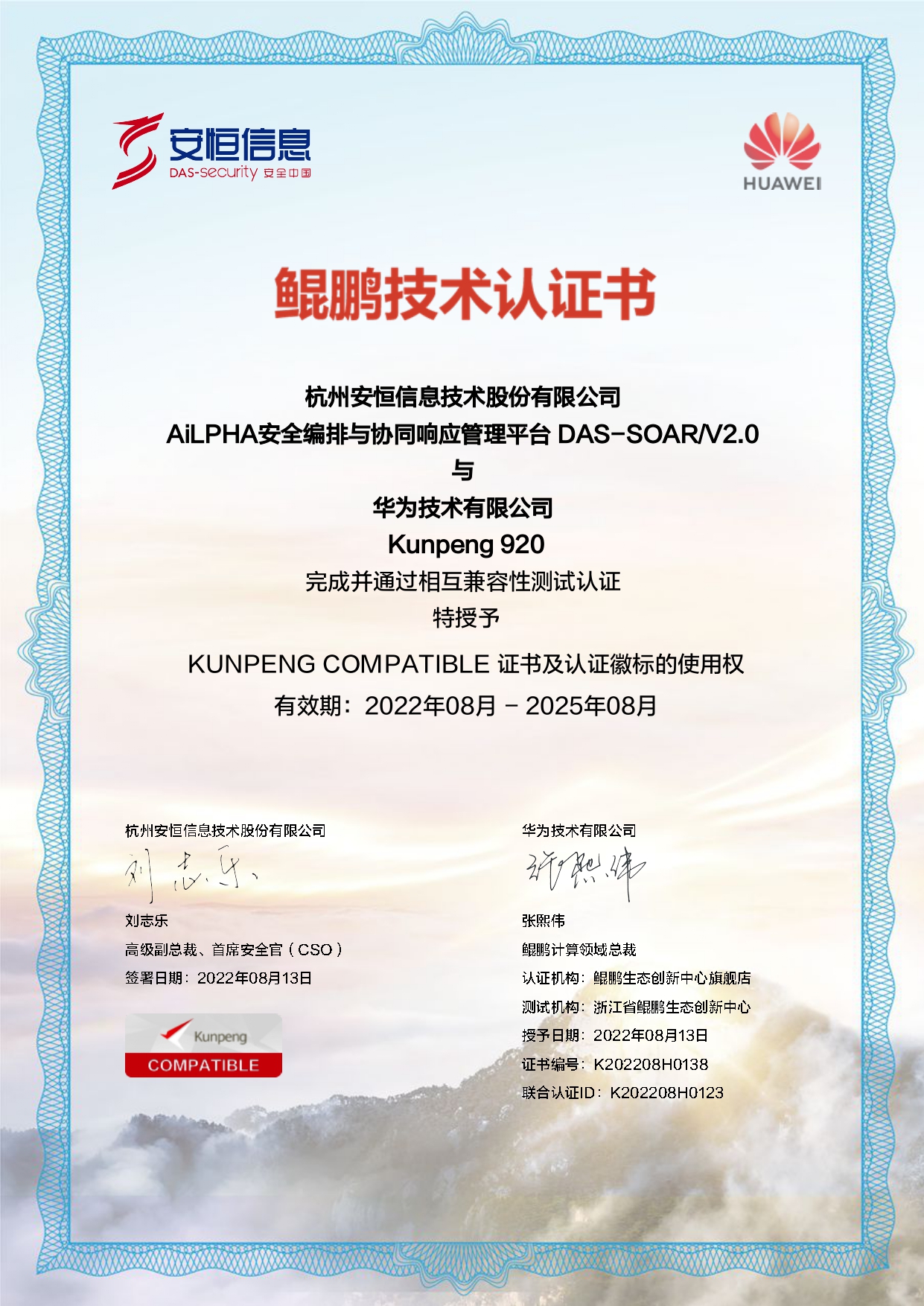 - 安恒信息AiLPHA大數(shù)據(jù)智能安全平臺(tái)、APT攻擊預(yù)警平臺(tái)分別與華為TaiShan 200系列完成兼容性測(cè)試。華為智能計(jì)算授予安恒信息HUAWEI COMPATIBLE證書(shū)及相關(guān)認(rèn)證徽標(biāo)使用權(quán)。