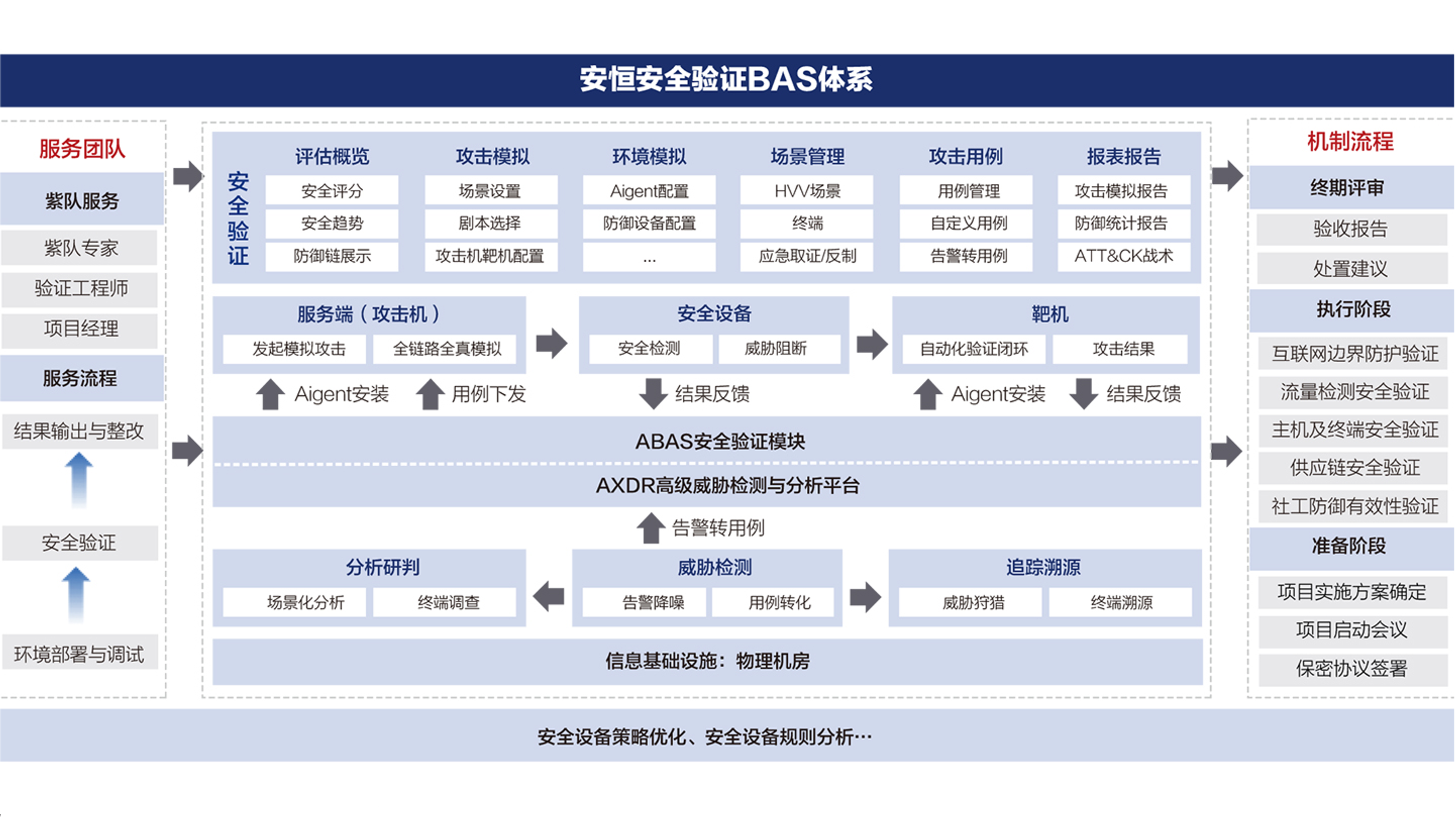 有效結(jié)合自動化工具及服務(wù)流程,充分發(fā)揮工具的自動化特性,高效實現(xiàn)對安全防御體系的所有組件的策略驗證。同時結(jié)合服務(wù)補(bǔ)足安全防御體系的全面性,從而幫助用戶體系化建設(shè)安全防御能力。